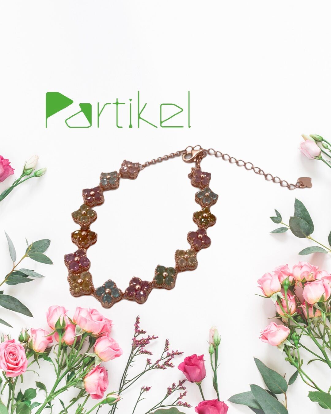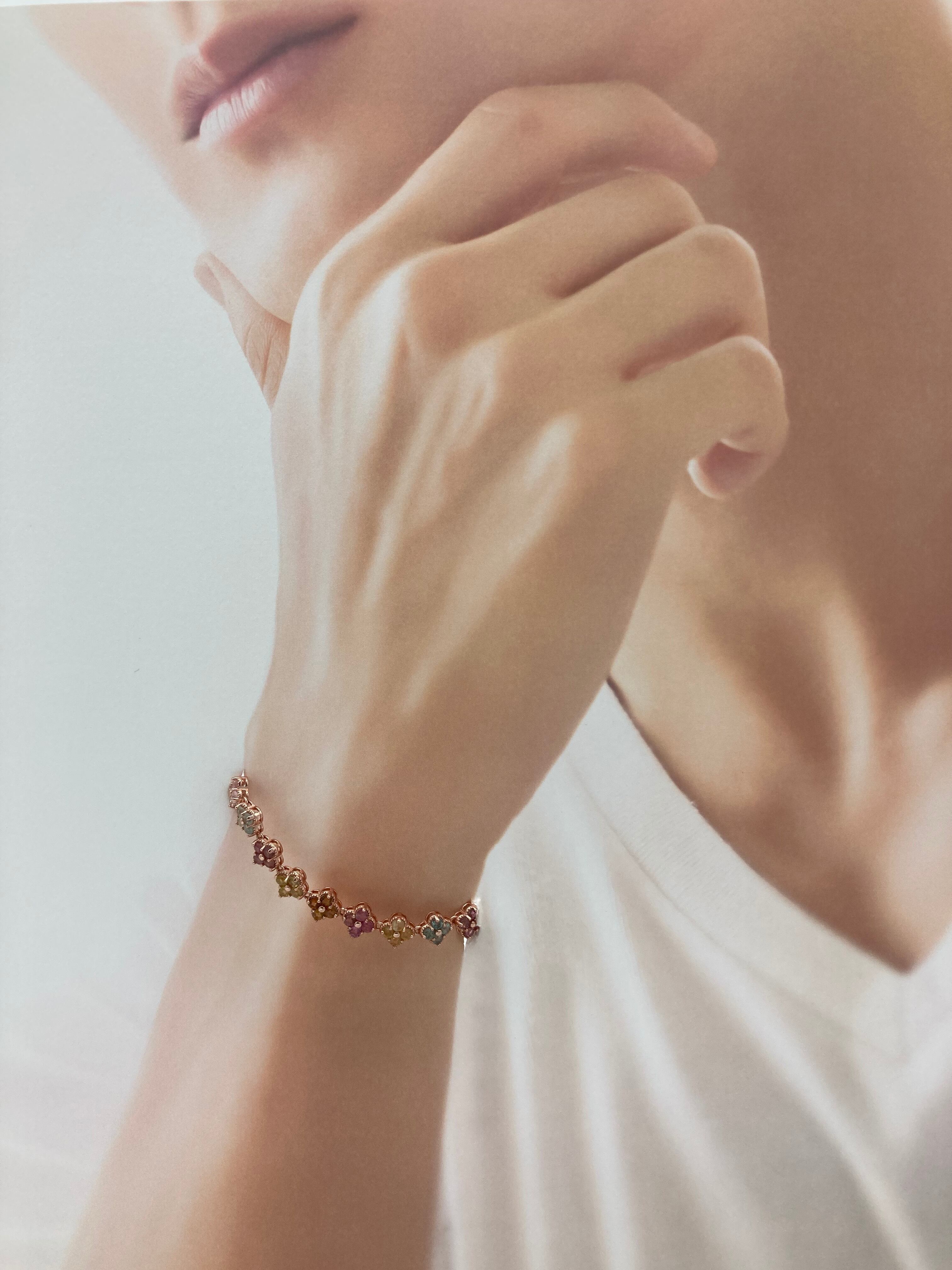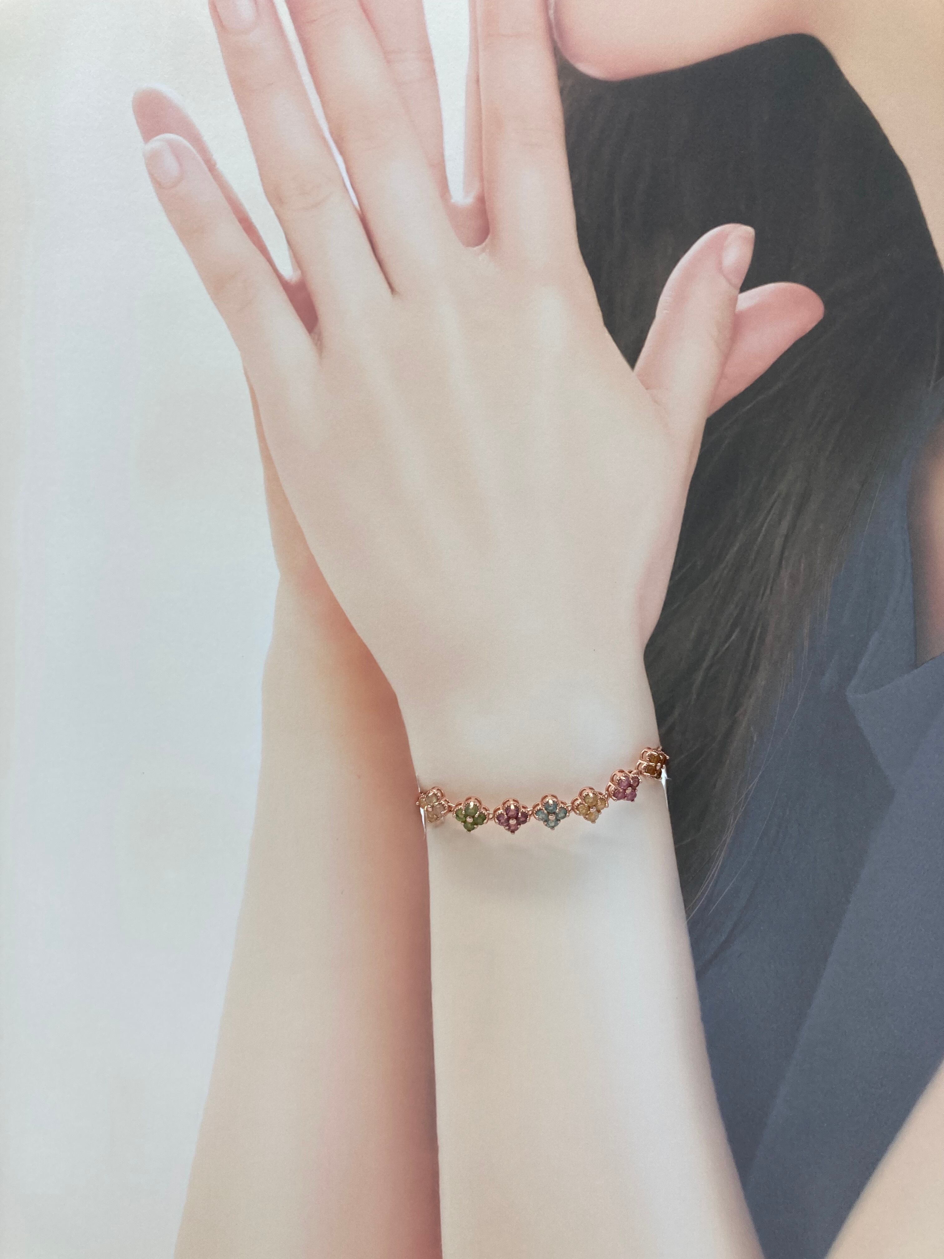 カラフルなお花モチーフブレスレットは、様々な色石を使用した華やかでかわいいアイテムです。お花のモチーフが楽しい気分を盛り上げてくれること間違いなし!ブルートパーズ、シトリン、ピンクトルマリン、スコロライトと、色とりどりの宝石が散りばめられていて、まるでお花畑を歩いているような気分にさせてくれます。