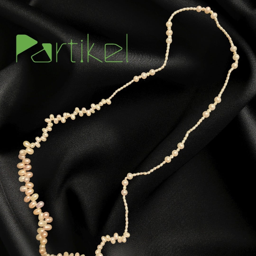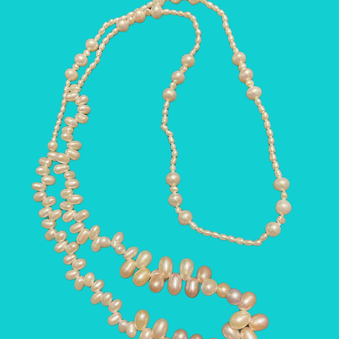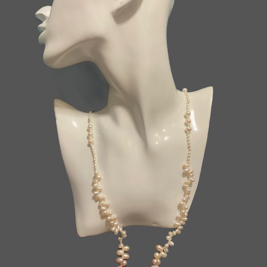 輝く淡水パールが煌めくロングネックレス。異なる形のパールが組み合わさり、独特の美しさを放っています。頭からかぶるタイプで、長さ83cmのネックレスは、一本でも存在感抜群。また、重ね付けしても素敵なアクセントになります。